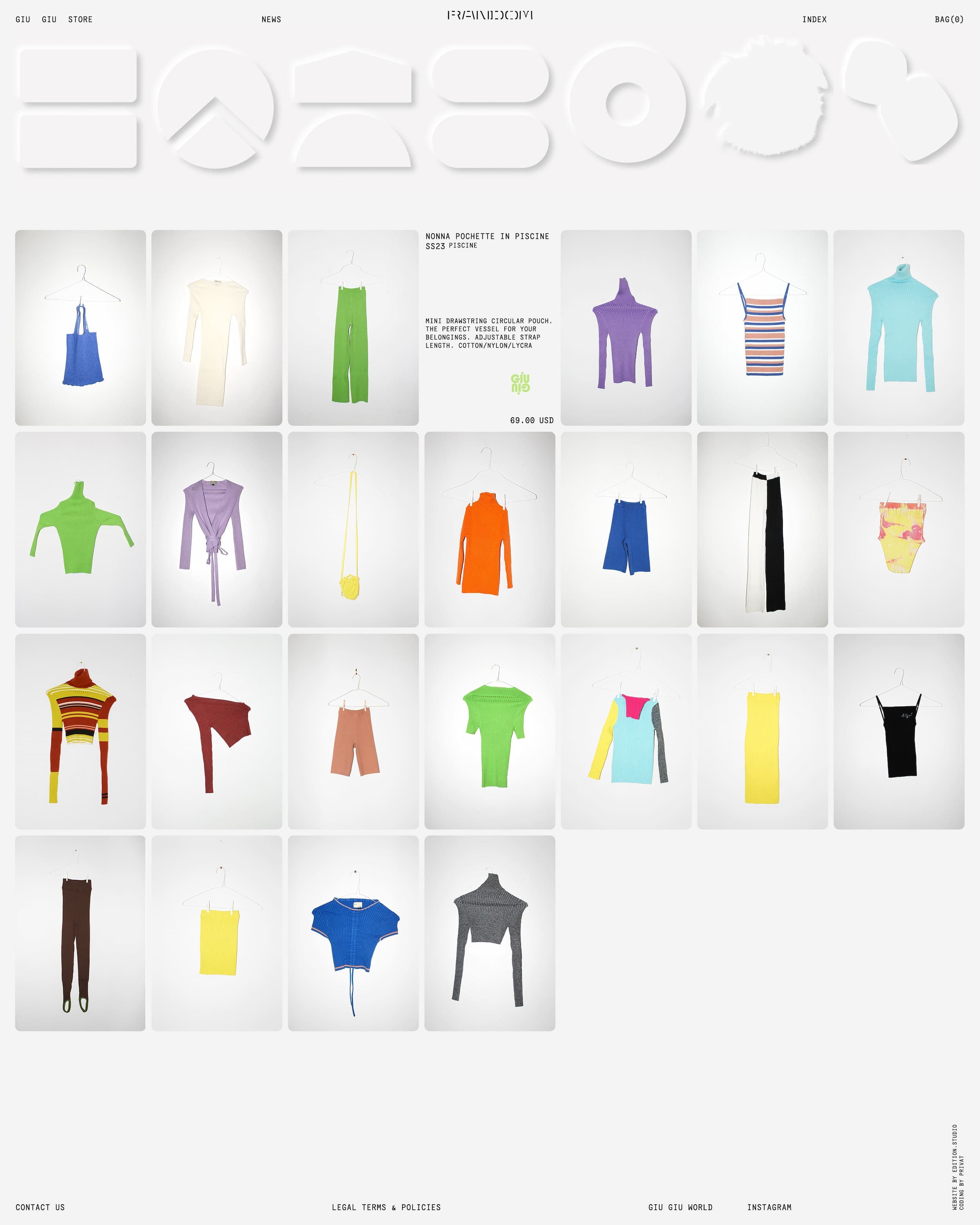 Giu Giu is a unique knitwear line based in Los Angeles, California known for colorful and body-hugging garments that fulfill a lifestyle bound by simplicity and offbeat freedom without limitation of age or gender. The website aesthetic blends playfulness and simplicity, mimicking the bouncy, three-dimensional fabric of the garments. Like the stretchy knit trim fabric, a custom variable typeface and springy animations offers a dynamic rhythm to the store experience. The navigation is done through oversized buttons and color dots as well as a structured index.