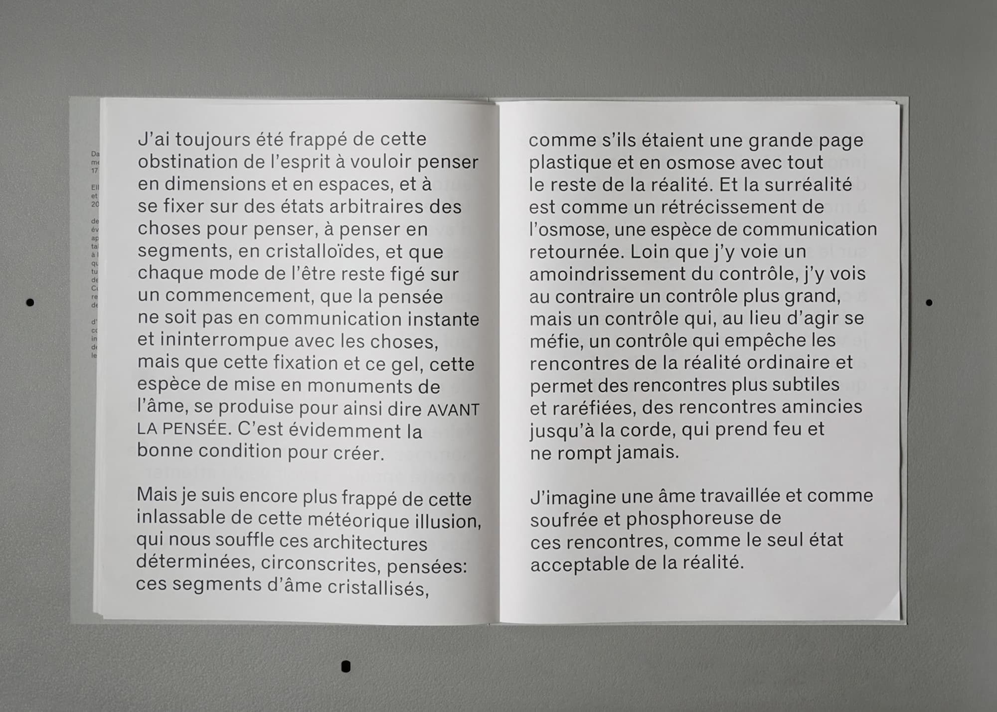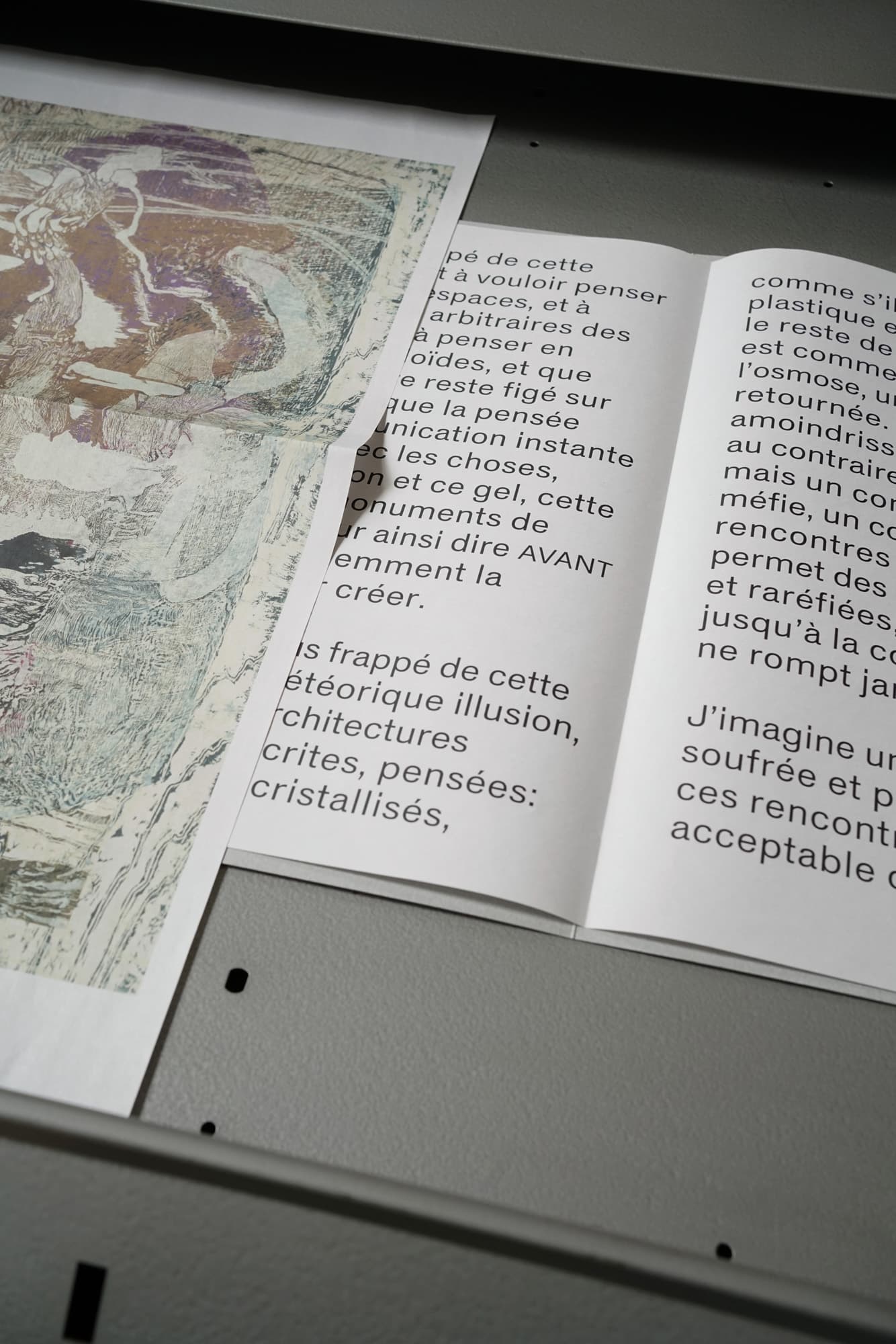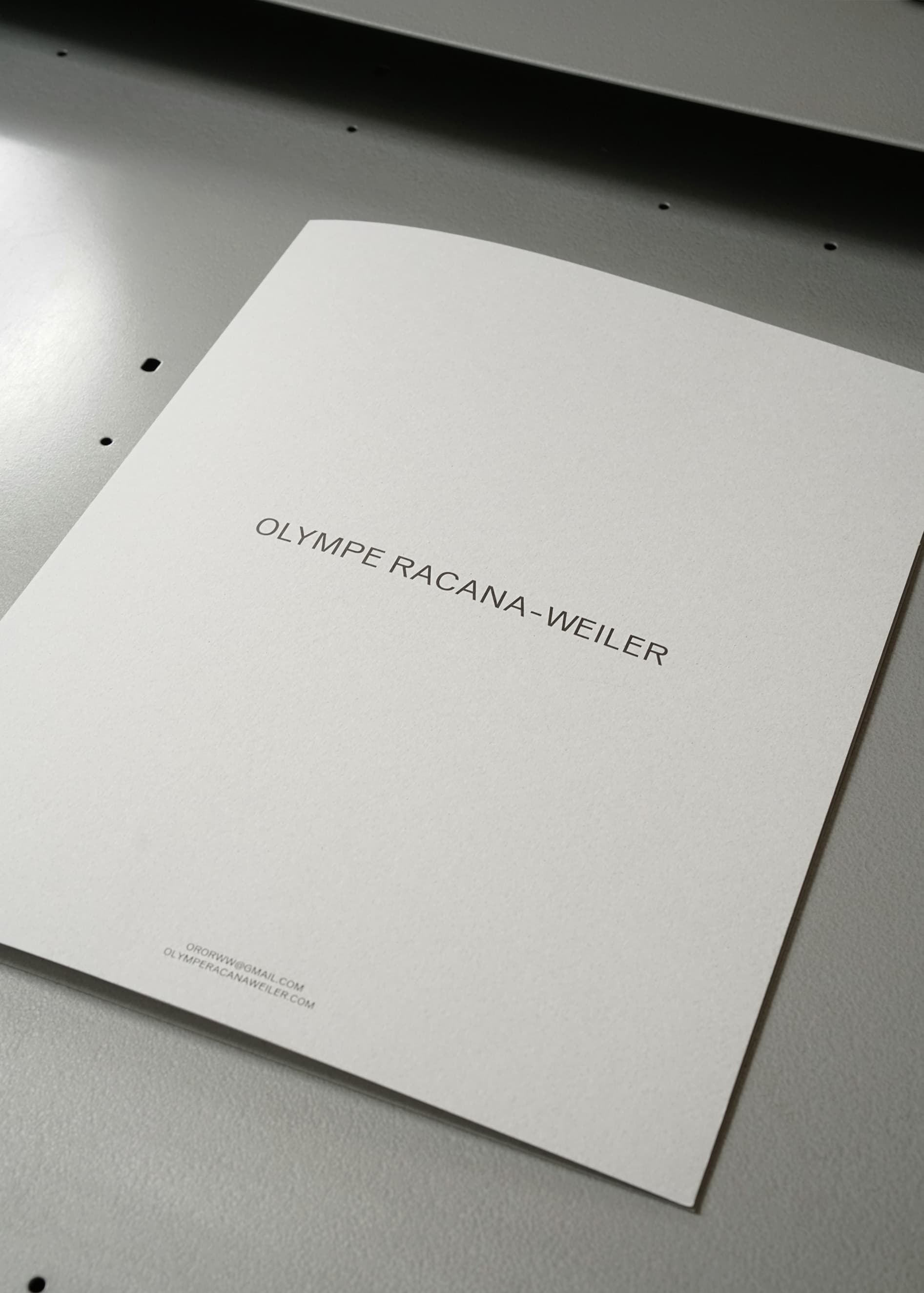 Olympe Racana-Weiler is a French Argentine painter. This publication presents the artist’s work, containing 5 paintings and 9 engraving reproductions, as well as aspirational text placed in the center of the newspaper. The large, folded format allows the intricate artworks to be printed large and manipulated freely with or separated from the rest of the publication. In parallel, we designed the artist's portfolio website, which is closely connected to the publication through shared typographic settings, a combination of full-bleed and centered images, and a similar structure divided into sections of text and visuals.